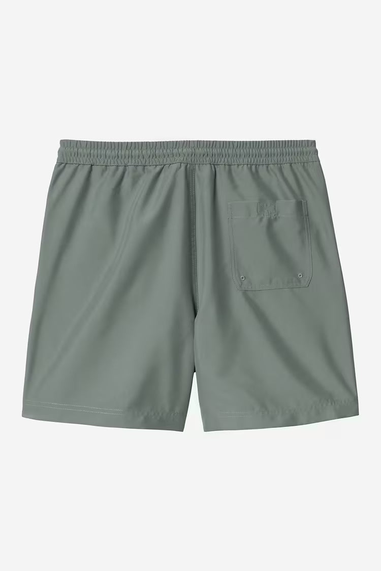 The Chase Swim Trunks are constructed from lightweight polyester fabric with water-repellent, fast-drying qualities. They also feature an inner mesh lining. The trunks have two side seam pockets, as well as a back pocket with a key holder. An embroidered 'C' Logo appears on the left leg.