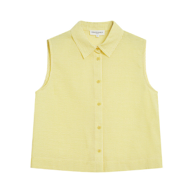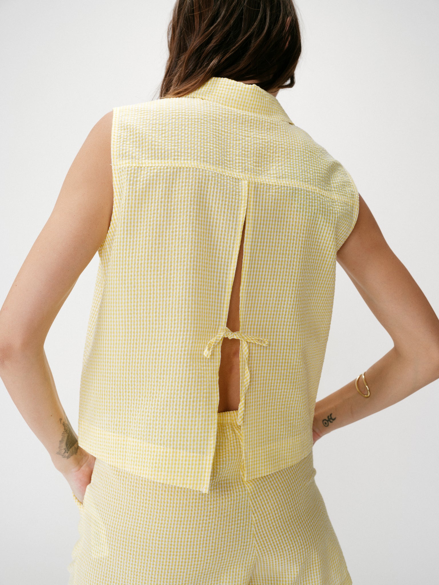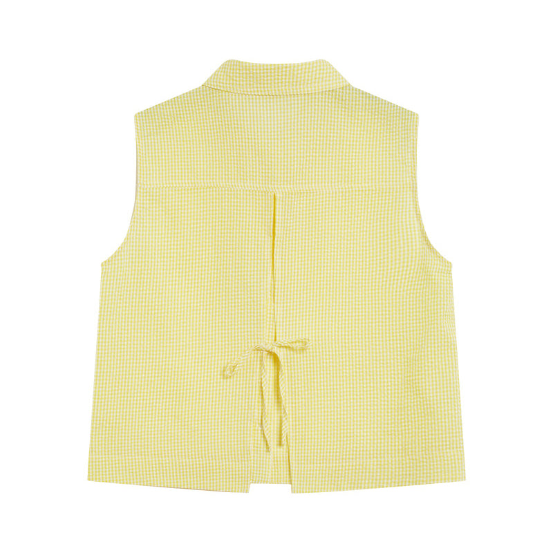 Product details :- Seersucker fabric- Small gingham check pattern- Sleeveless Top- Tie detail at the back