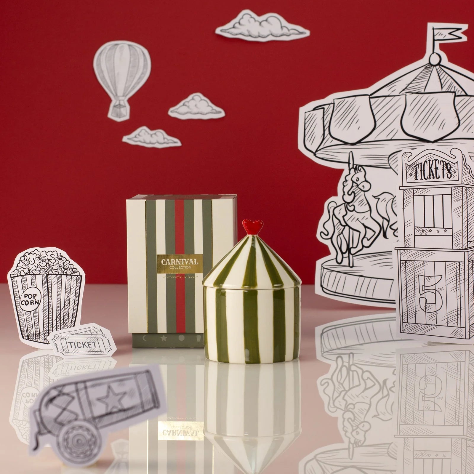 | Housed in a striped ceramic vessel inspired by a classic circus tent, this candle with a lid brings playful charm with stylish olive green stripes that elevate any space.