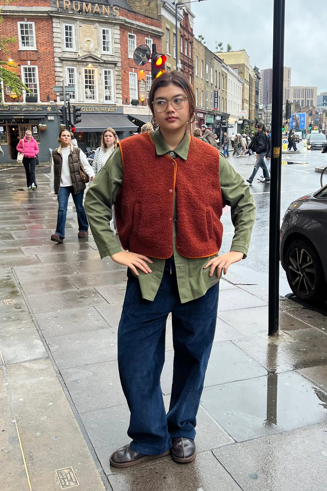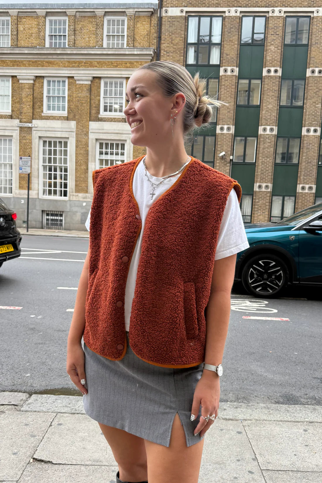 ØST is an East London based Danish design-team creating timeless pieces of clothing, footwear and accessories. crafted from soft, textured fleece that adds both warmth and style to any outfit. Designed in a beautiful rust shade with subtle contrast binding, it’s perfect for layering over shirts, knits, or dresses when the temperature dips. Relaxed, boxy fit  |