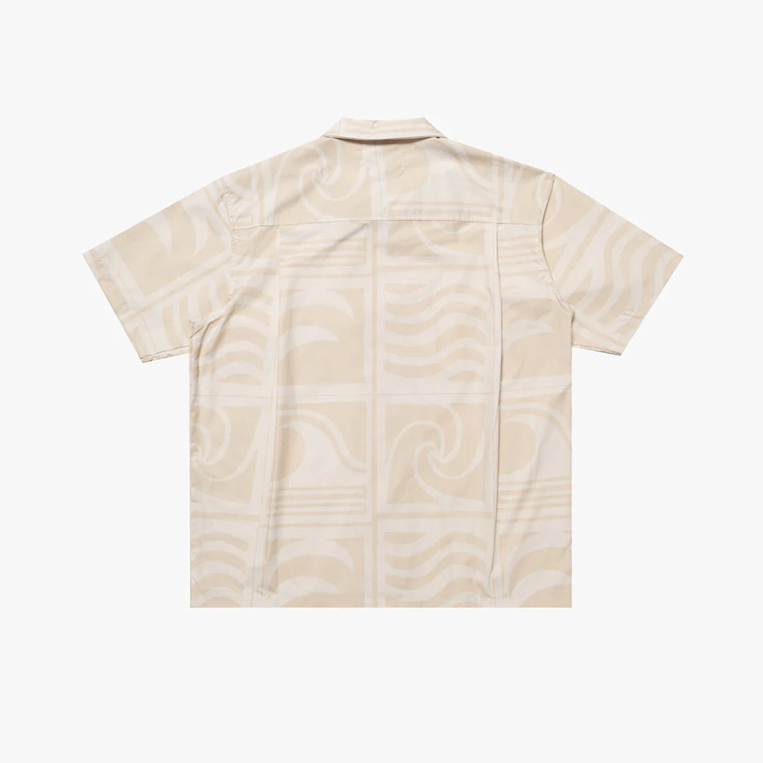 The Huntingdon Shirt in Beach. A Boxy fit shirt with a classic revere collar, made from a breathable 100% organic cotton poplin. Featuring a tonal all-over wave print, coconut button fastening and an embroidered logo on the hem.
