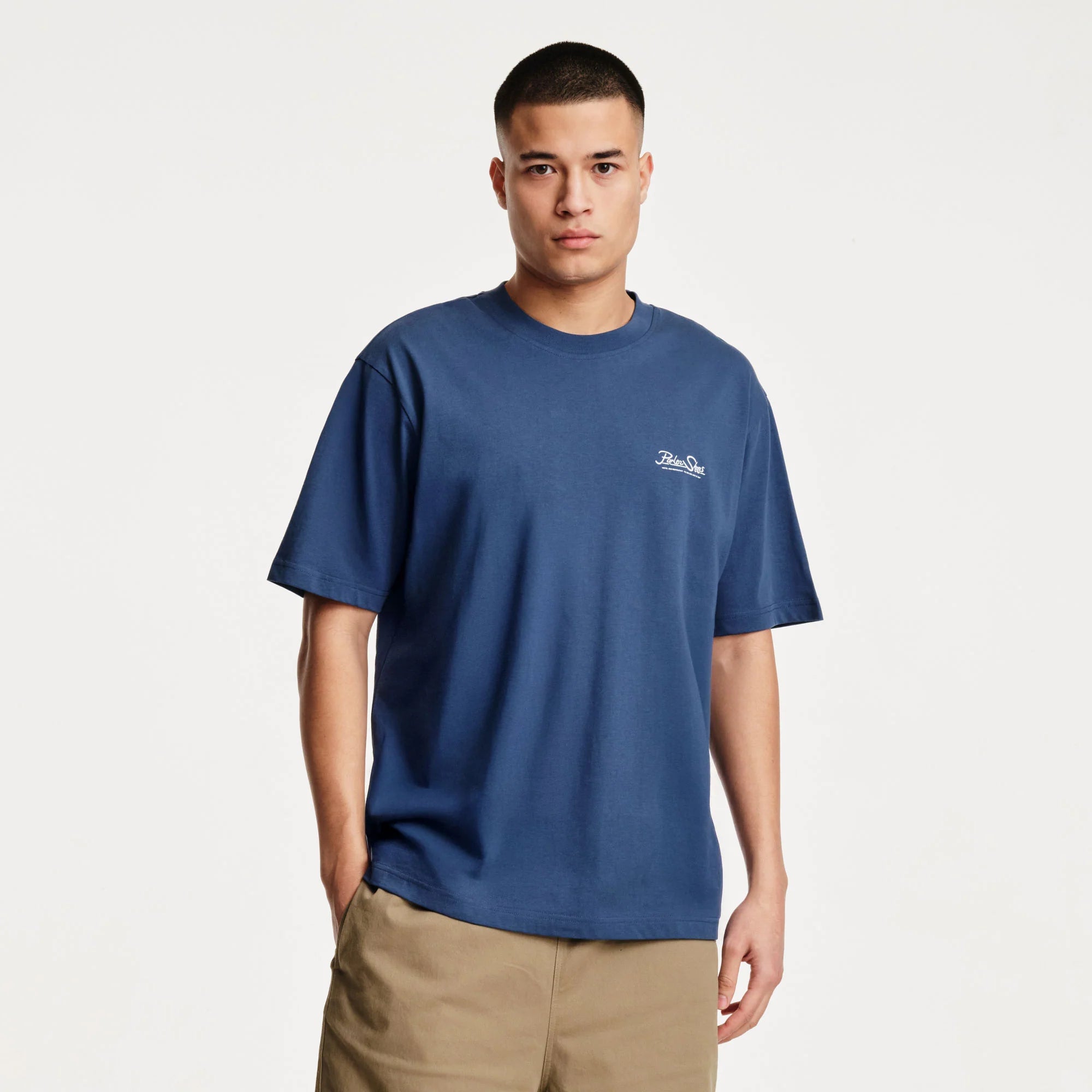 The Vacancy T-Shirt in Lagoon. A short sleeve tee crafted from premium GOTS Certified, 100% organic cotton with a classic ribbed crewneck. Detailed with a small, printed logo on the chest and a large design on the back. 100% GOTS Certified Organic Cotton Ribbed Crewneck Printed Front & Back Design |