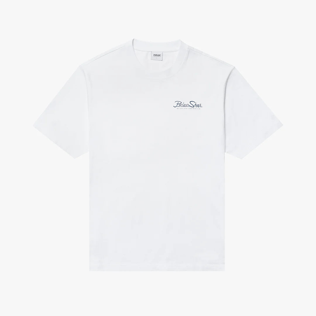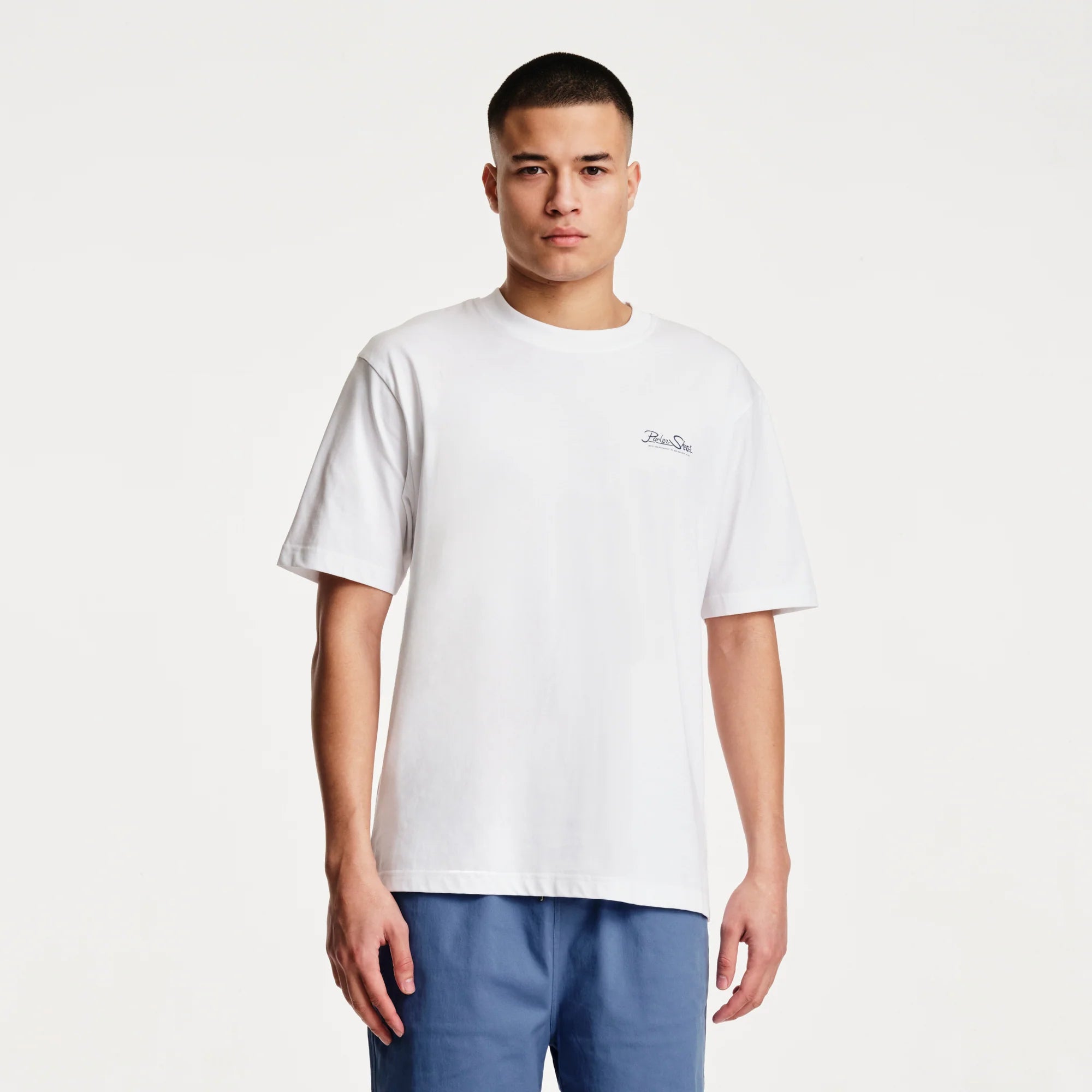 The Vacancy T-Shirt in White. A short sleeve tee crafted from premium GOTS Certified, 100% organic cotton with a classic ribbed crewneck. Detailed with a small, printed logo on the chest and a large design on the back. 100% GOTS Certified Organic Cotton Ribbed Crewneck Printed Front & Back Design |