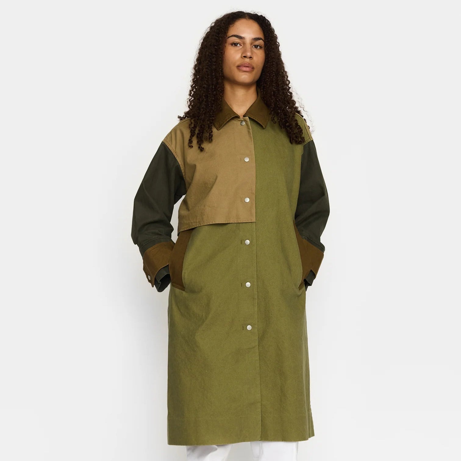 This slightly oversized coat with trench-coat-inspired details and a subtle block-color effect is crafted in heavy cotton oxford fabric. The coat is without lining, with bindings on the seams inside and it is designed with chunky angled duo welt pockets, and a storm flap front and back. The coat has a metal snap-button-closure and chunky buttoned cuff straps. The slit on the backside is closed with hidden snap-buttons, which can be opened if more flexibility is needed