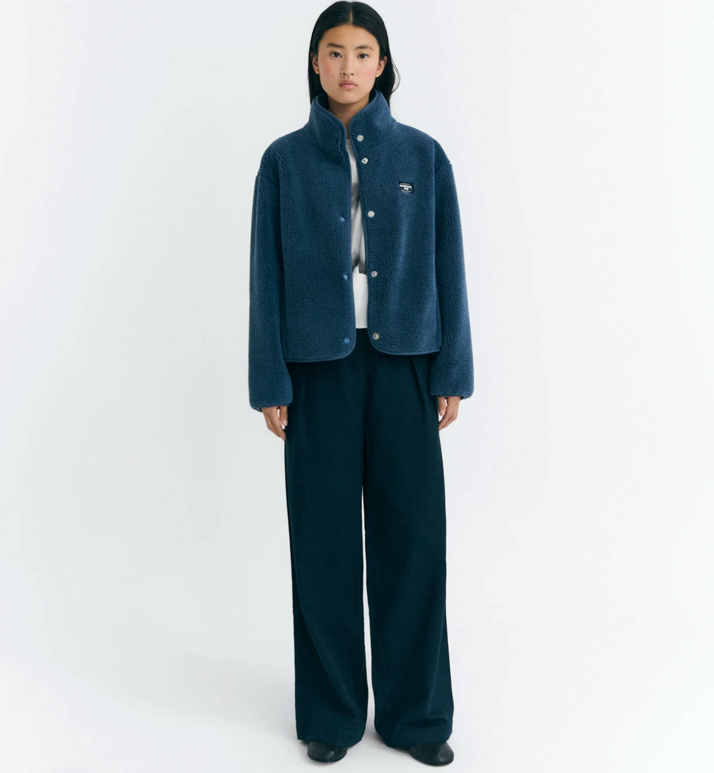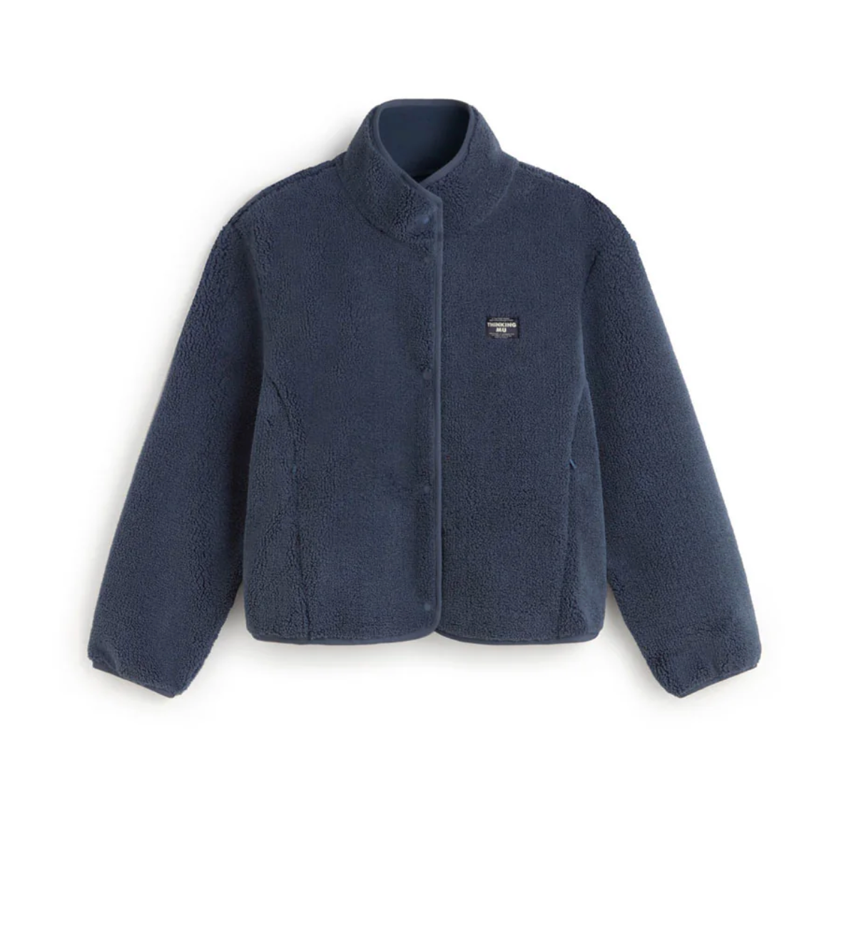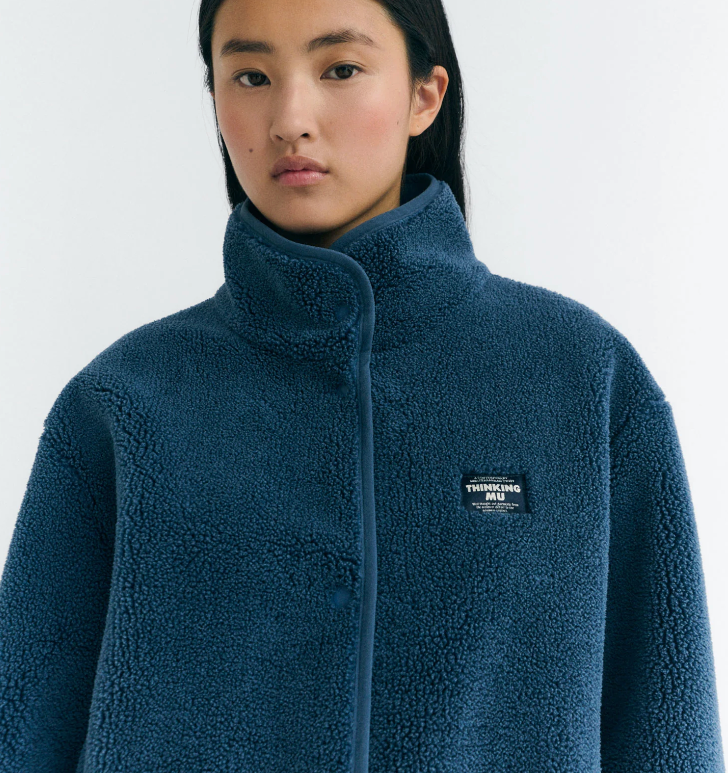 → High collar → Long sleeves → Relaxed fit → Snap button front closure → Side pockets → Fabric details: sheepskin, fake fur → Fabric: recycled polyester, weight 530 gsm (thick fabric) → Garment length: regular
