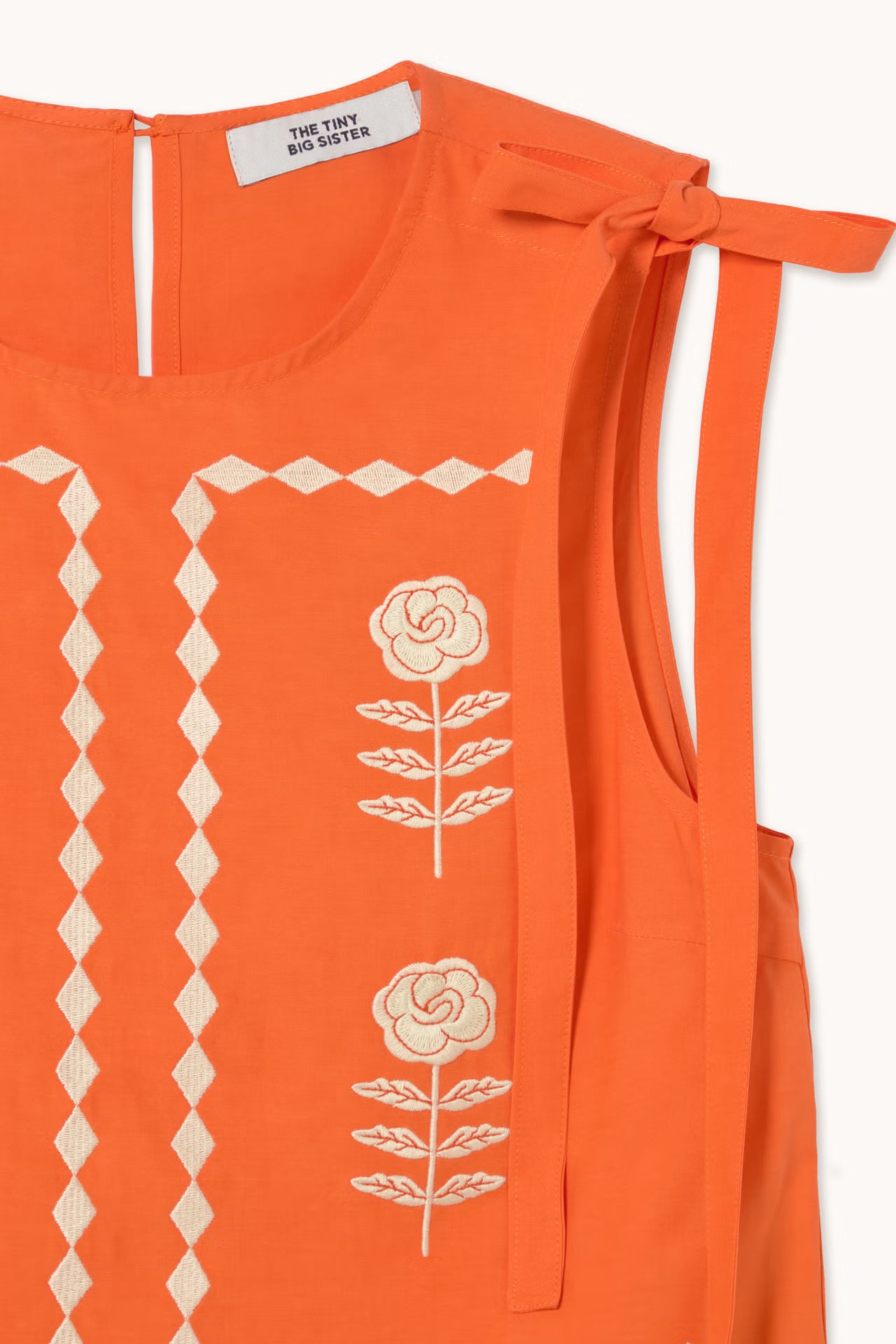 Sleeveless top in a cotton-viscose-linen blend with a subtle texture, lightweight and breathable with a soft, fluid drape. Features a clean round neckline, a discreet back loop closure, and adjustable shoulder ties that form soft bows. Summer-red base with embroidered flowers and diamond elements on the front. Matching skirt available.Carefully designed in Barcelona. Crafted in China in BSCI certified factories, following responsible and sustainable practices every step of the way. Composition: |