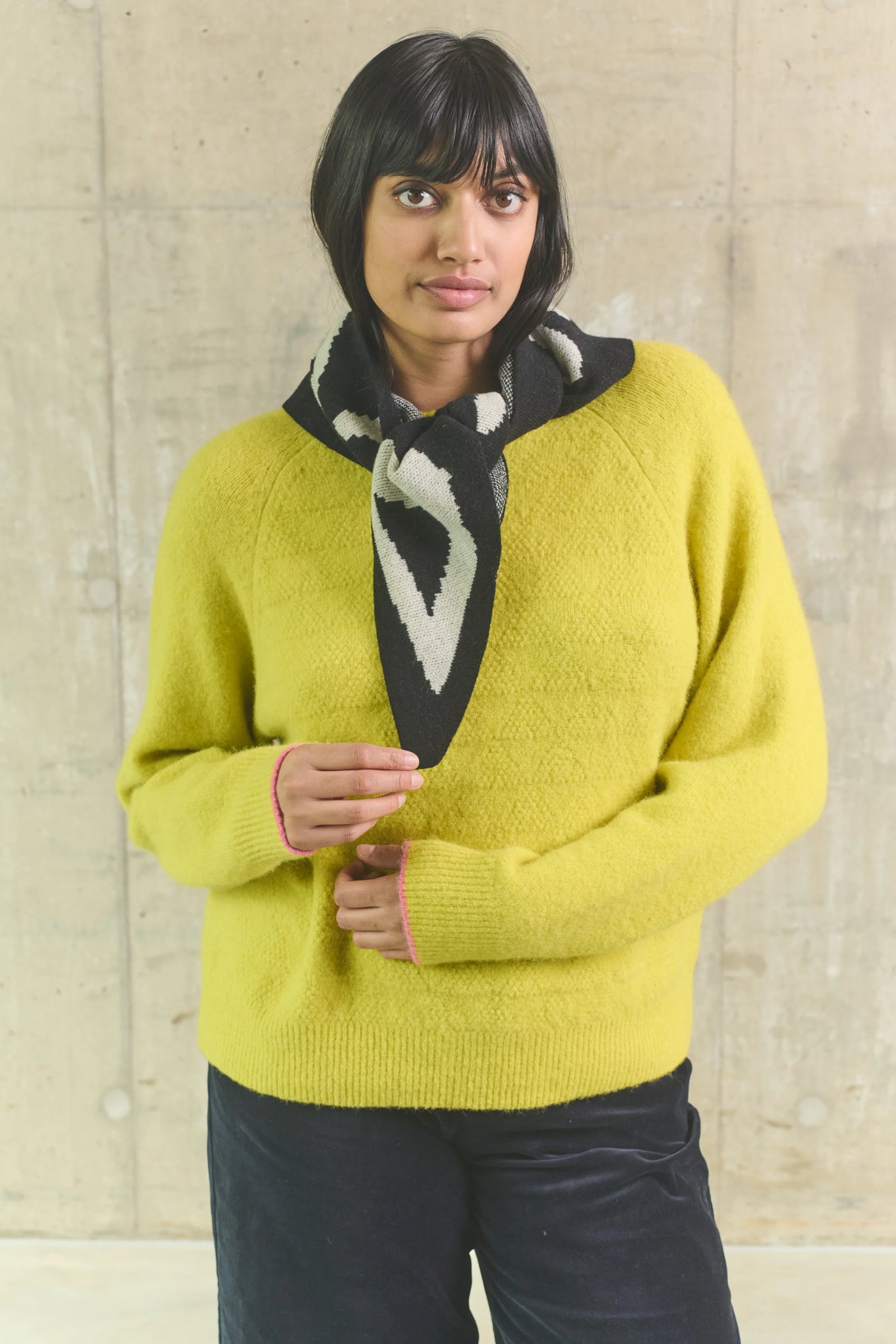 The triangle shape offers easy styling—wear as a neckerchief, shawl, or headscarf for a playful, modern look. Soft, warm, and full of character.