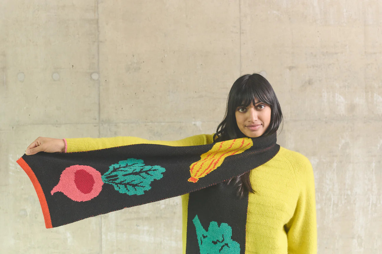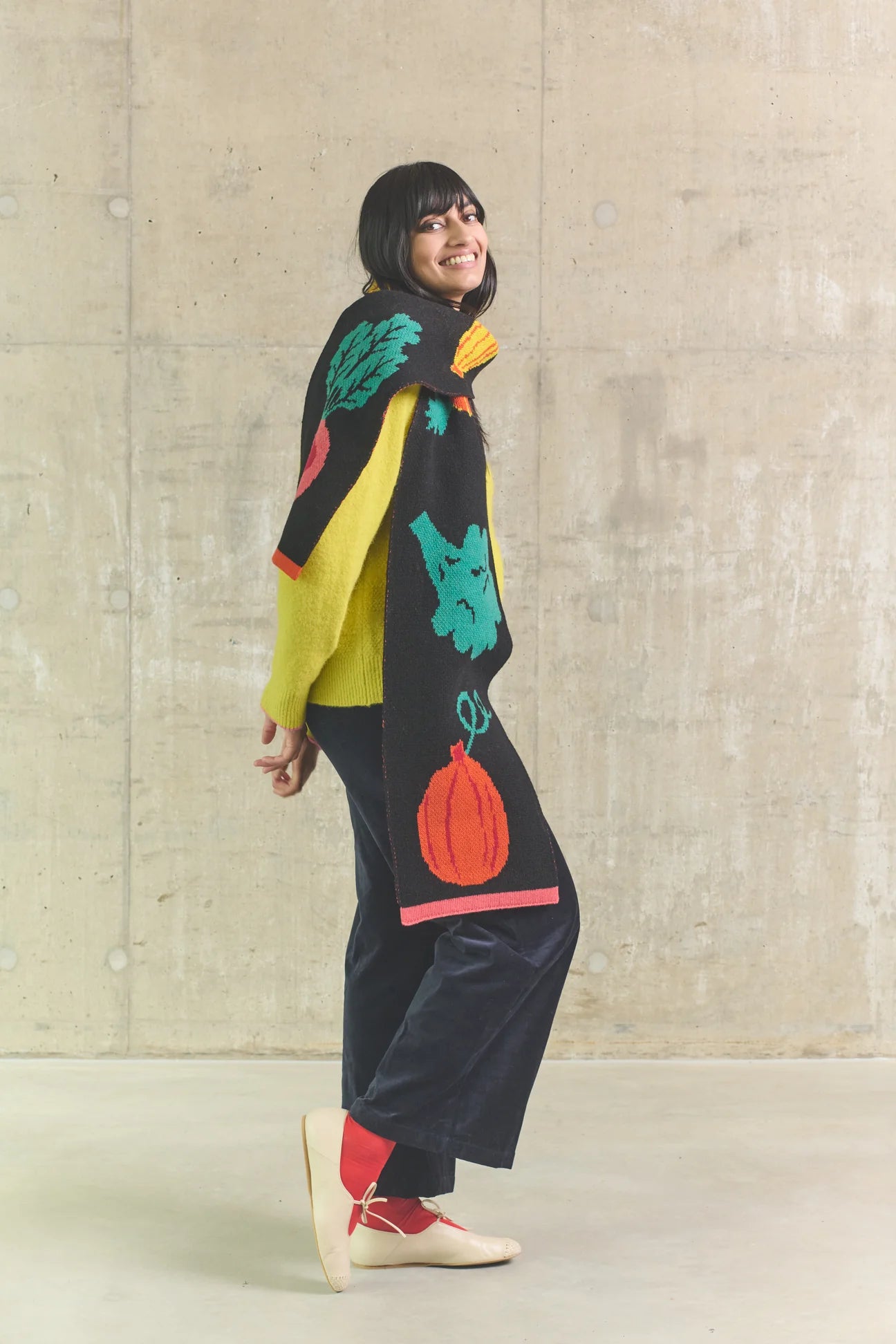Add a playful twist to winter with the Vegetables Wool Scarf – Large. A black base showcases colourful veggies—pumpkin, beetroot, squash, and broccoli—in bold pops of green, orange, pink, and yellow. Made from a cosy wool blend, this oversized scarf is warm, soft, and perfect for wrapping or layering. A cheerful way to brighten grey days. Designed in London and ethically knitted in Istanbul. |