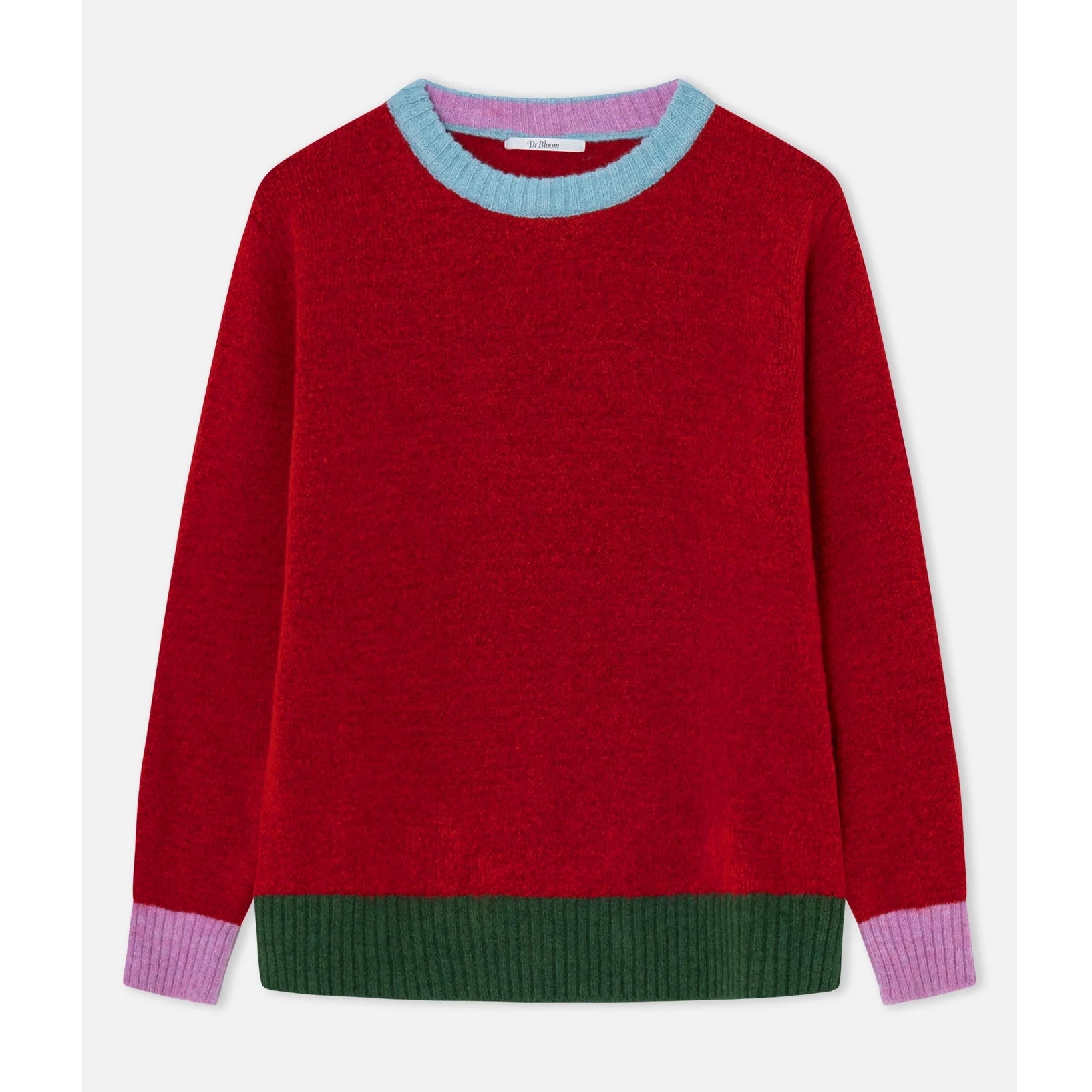 Ideal for a casual style with a distinctive touch. Red wool sweater. Straight cut with long sleeves and a ribbed round neck finish. Combines a main body in red with contrasting details: sky blue collar, pink cuffs, and dark green hem. Features ribbed finishes on the collar, cuffs, and waist that provide fit and comfort.