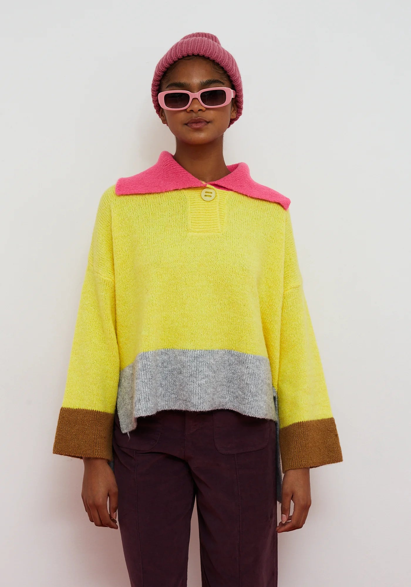 An ideal garment to stand out with style on cold days. Oversized straight-cut sweater in a yellow base color. Dropped sleeve and asymmetrical gray hem with side slit. Features an XL shirt-style collar in pink with a front button closure. The wide cuffs finished in brown add an original and vibrant touch. Size guide Production: Designed in Barcelona, made in Italy. About the brand: Dopamine fashion to fill your closet with colour. Dr Bloom was born in Barcelona in 2012 out of fun and a need for something different. The brand loves art, creativity and fun. They design differential collections with 'mood playful' for women who have fun dressing up. They create vibrant garments with the intention of making you feel radiant. Dr Bloom produces in small small workshops in Europe for direct control over production with an ethical vision of the entire chain. They are committed to local production, sustainable packaging and the use of natural, recycled or ecofriendly fibers. They believe that a better fashion industry is possible and are working little by little towards greater sustainability. |