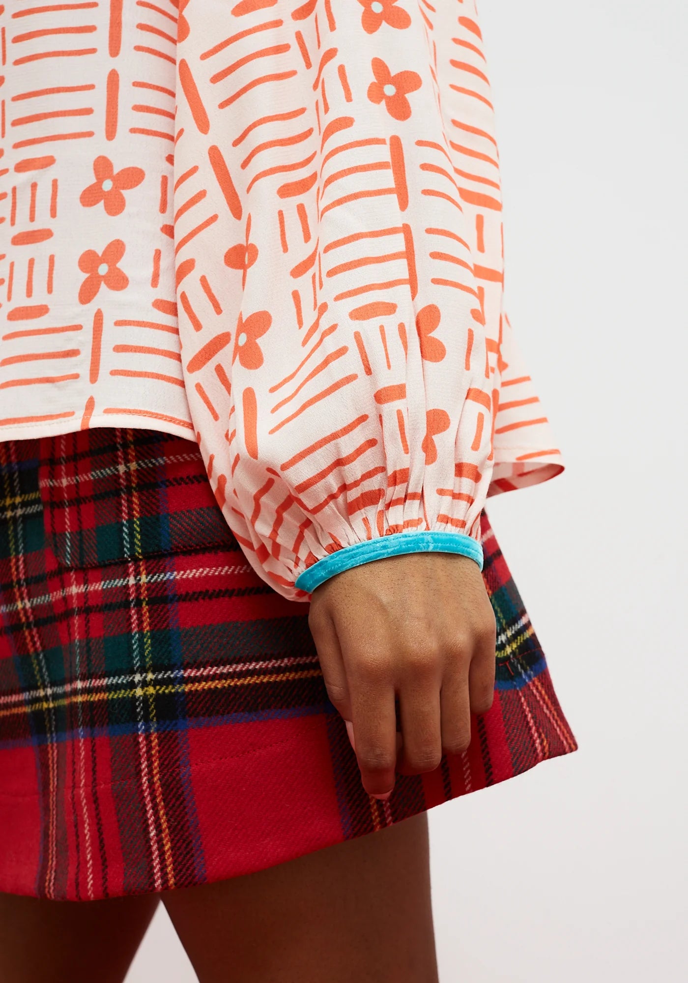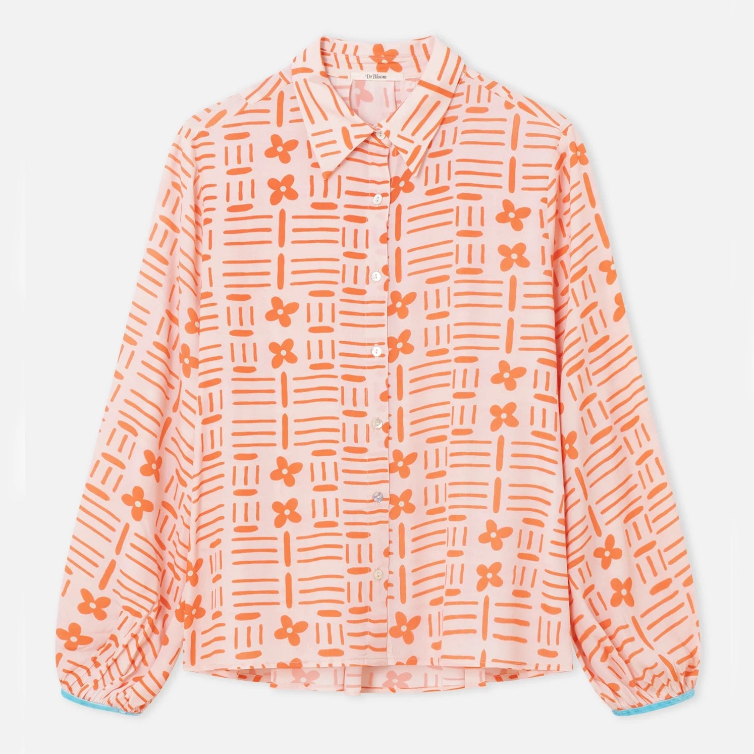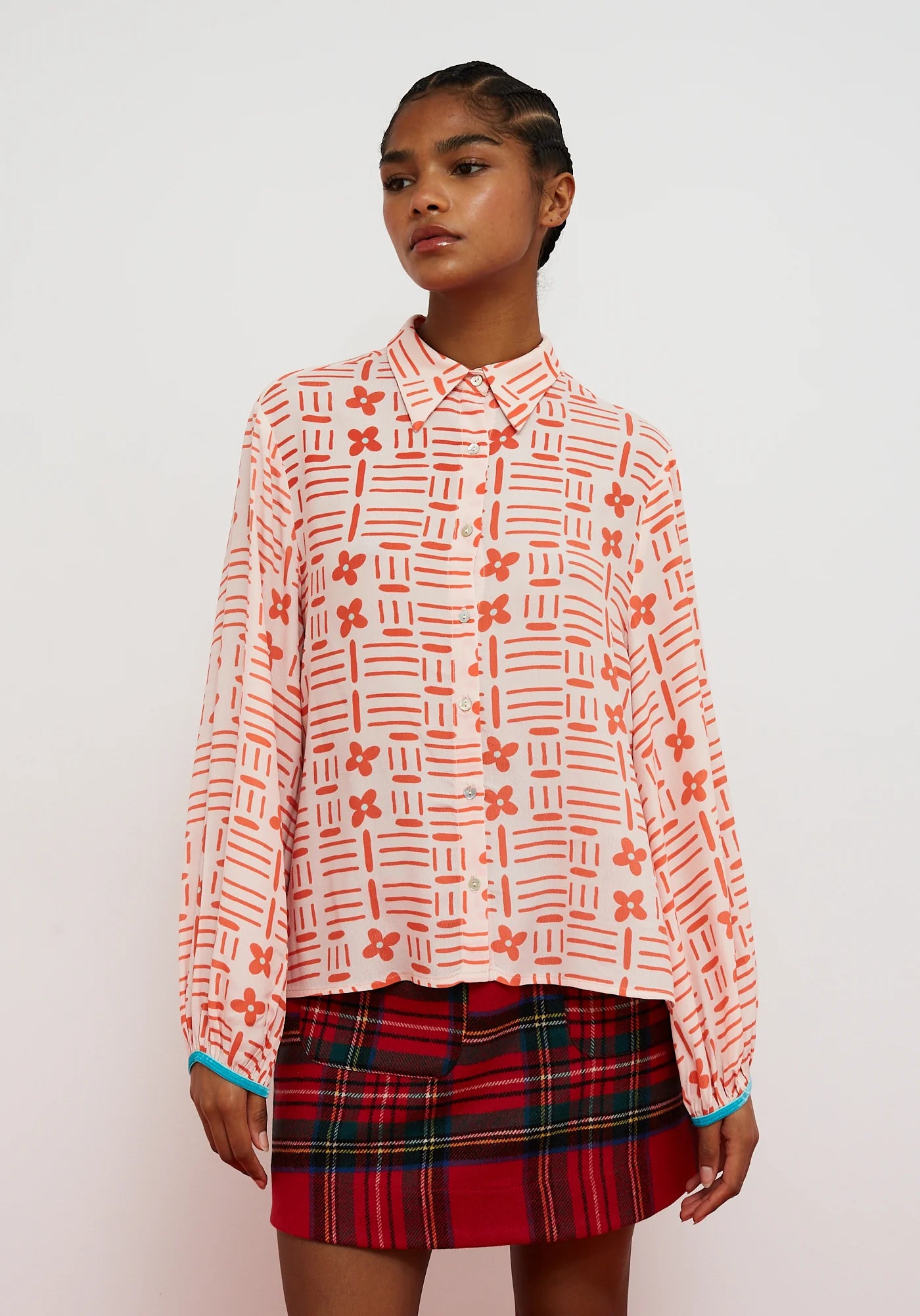 Fluid and fresh. A shirt that steps away from the formal. Fluid shirt with red floral print. Classic collar and front button closure. Long sleeves finished with elastic cuffs for more comfort, with blue detail. Straight cut and pleats on the back providing movement.
